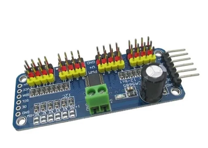 It’s an I2C-controlled PWM driver with a built-in clock. That means you do not need to continuously send it to signal to tie up your microcontroller, it is completely free running!