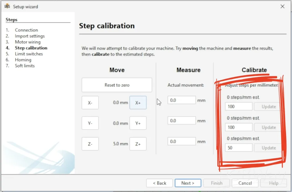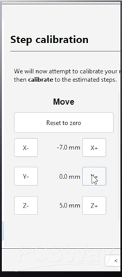 The calibration section allows you to set the initial position of all axes by moving them precisely. Update the calibration section millimeter values for this plotter with the values on the screen.